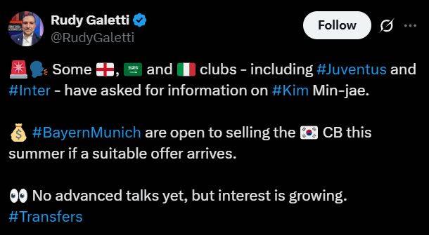 이탈리아 축구 소식에 능통한 것으로 알려진 루디 갈레티는 12일(한국시간) 자신의 사회관계망서비스(SNS)를 통해 "일부 프리미어리그 클럽과 사우디아라비아 클럽, 이탈리아 클럽이 김민재에 대한 정보를 요청했다"면서 "이탈리아 클럽에는 유벤투스와 인터 밀란이 포함됐다. 뮌헨은 이 클럽들로부터 적절한 제안이 들어온다면 여름 이적시장에 김민재를 매각할 가능성이 있다. 아직 진행된 협상은 없으나 그를 향한 관심은 커지고 있다"라고 전했다.