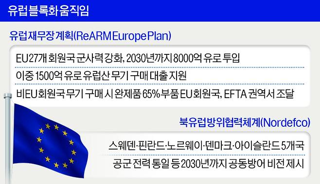 다만 유럽의 블록화 대응이 급선무다. EU는 유럽 재무장 계획을 발표하면서 비EU 회원국의 무기 구매 시 완제품 가격의 65%에 해당하는 부품을 EU 회원국이나 유럽자유무역협정(EFTA) 권역 등에서 조달해야 한다는 조항을 붙였다. 이런 요건을 맞추기 위해서는 국내 기업들은 유럽 현지화를 서둘러야 하는 입장이다.
