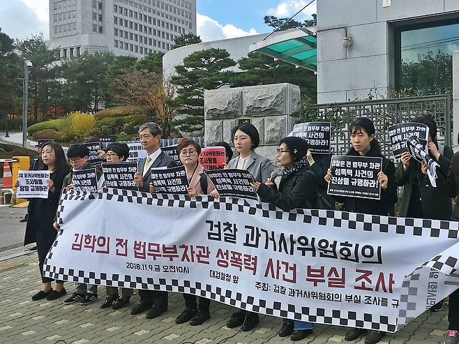 | ▲ '김학의 전 법무부 차관 성폭력 사건'의 피해자가 이 사건을 재조사 중인 검찰과거사위원회(아래 과거사위)를 향해 "부실 조사, 2차 피해"를 폭로하며 "조사팀 교체"를 요구했다. 피해자 A씨는 2018년 11월 9일 오전 대검찰청 앞에서 한국여성의전화 등과 기자회견을 열어 "진실을 외치고 간곡히 부탁했지만 과거사위는 형식적인 조사를 진행해 저를 이 자리까지 나오게 만들었다"라며 이 같이 밝혔다. |