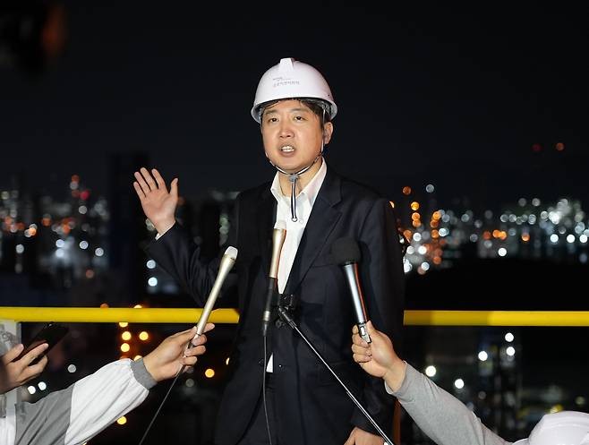 | ▲ 이준석 개혁신당 대선 후보가 제21대 대통령 선거 공식 선거운동 첫날인 12일 새벽 전남 여수시 금호피앤비화학 여수2공장을 방문해 발언하고 있다. |