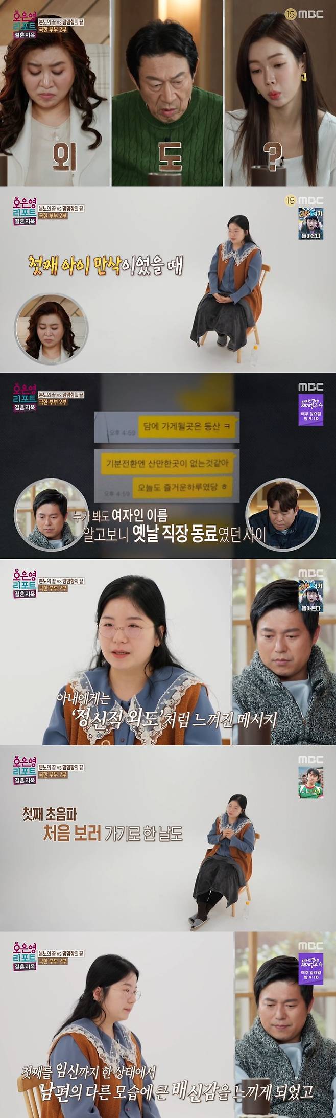 아내가 말한 사건은 무엇이었을까. 남편은 "아내랑은 말이 통하지 않으니 다른 사람이 필요한 거다. 저의 출구"라며 "따지고 보면 원인이 아내로부터 생겨난 건데 자꾸 외도라고 그런다"고 말했고, 아내는 "첫째 아이 만삭이었을 때 어떤 사건이 있어서 너무 궁금해서 남편 핸드폰을 잘 때 봤다"며 입을 열었다.