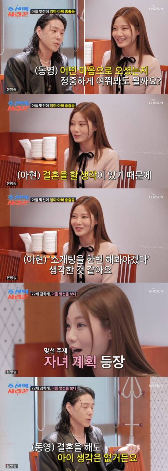 12일 방송된 TV조선 '조선의 사랑꾼'에서는 김학래와 임미숙의 아들 김동영이 배아현과 김나희와 맞선을 보는 장면이 전파를 탔다.