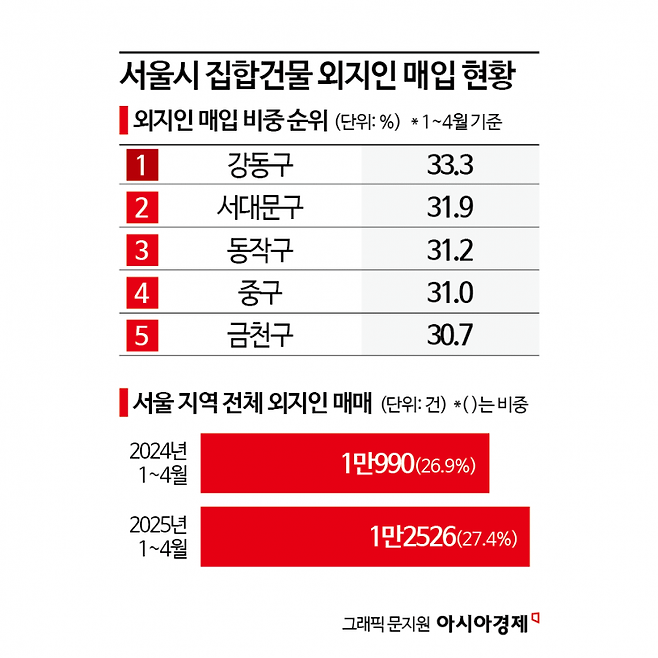 자치구별로는 강동구가 33.3%로 외지인 매입 비율 1위를 기록했다. 이어 서대문구 31.9%, 동작구 31.2%, 중구 31.0%, 금천구 30.7%로 뒤를 이었다. 전통적인 인기 지역으로 통하는 강남3구는 평균과 비슷한 수준이었다. 강남구(26.7%)와 서초구(26.5%)는 서울 평균(27.4%)을 밑돌았다. 송파구(28.1%)는 평균을 소폭 웃돌았다.