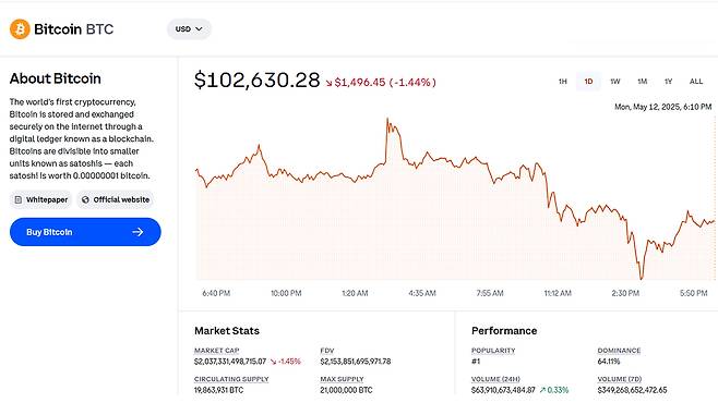 미국 가상화폐 거래소 코인 베이스에서 미 동부 시간 저녁 6시 10분 기준 비트코인의 개당 가격은 24시간 전보다 1.44% 내린 10만 2,630달러에서 거래됐습니다.