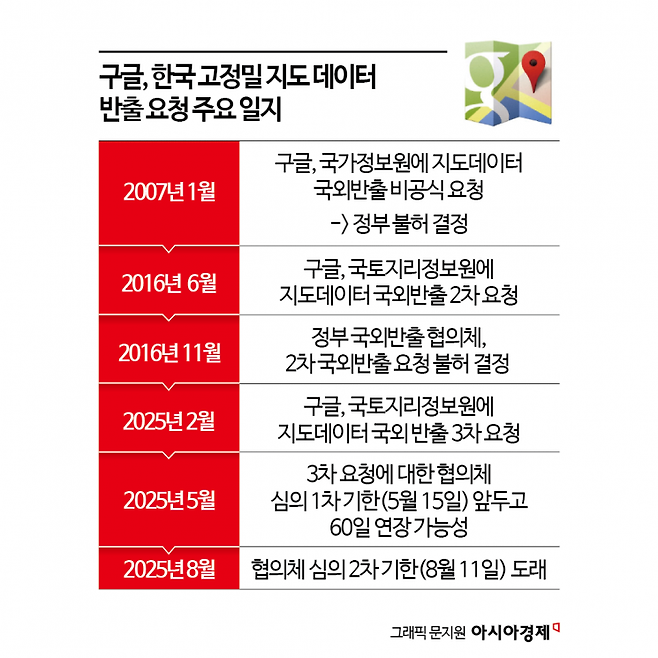 구글의 요청 건은 국토지리정보원장 주재로 7개 부처(과학기술정보통신부·외교부·통일부·국방부·행정안전부·산업통상자원부·국가정보원)와 민간위원 1명 등 총 9명으로 구성된 협의체에서 심사를 거친다. 이 협의체 구성원 9명 모두 찬성해야 반출이 허용된다. 국토지리정보원 관계자는 "심도 있는 검토가 필요해 당초 1차 기한인 오는 15일 발표를 60일 이후로 연기했다"며 "다만 2차 기한인 8월 11일 전에도 협의체가 열려 수시로 논의되고 결론 날 수 있다"고 했다.