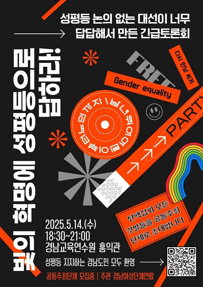 경남여성단체연합을 비롯한 단체들이 오는 14일 저녁 경남도교육청 교육연수원 홍익관에서 "빛의 혁명에 성평등으로 답하라"는 제목으로 긴급토론회를 연다.