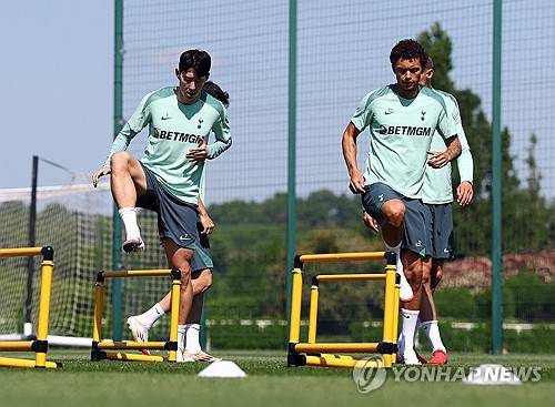 손흥민은 12일 훈련 중 브레넌 존슨, 미키 판더펜, 데스티니 우도기, 세르히오 아궤로 등 동료들과 가볍게 몸을 풀며 호흡을 맞췄다. 동료들과 함께 웃고 어깨를 두드리며 대화하는 밝은 모습이었다.
