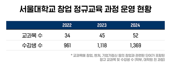 서울대학교는 창업 친화적 학사제도와 교과목 확장을 통해 모험정신을 북돋고 있다. 최근 통계에 따르면 2022년 창업교과목이 34개(수강생 수 961), 2023년 45개(수강생 수 961), 2024년 52개(수강생 수 961)로 증가하였고, 수강생들도 꾸준히 늘고 있다. 이는 대학 교육의 콘텐츠와 철학이 변하고 있음을 보여준다.