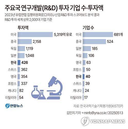 (서울=연합뉴스) 김민지 기자 = 13일 한국과학기술기획평가원(KISTEP)에 따르면 2023년 기준 우리나라에서 연구개발(R&D)에 투자를 많이 하는 40개 기업의 투자액이 한해 60조원을 웃돌며 세계 5위를 기록한 것으로 파악됐다.