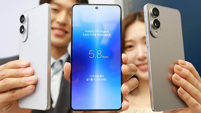 ▲ 13일 서울 삼성 강남에서 초슬림형 스마트폰인 삼성전자 갤럭시 S25 엣지가 공개되고 있다.