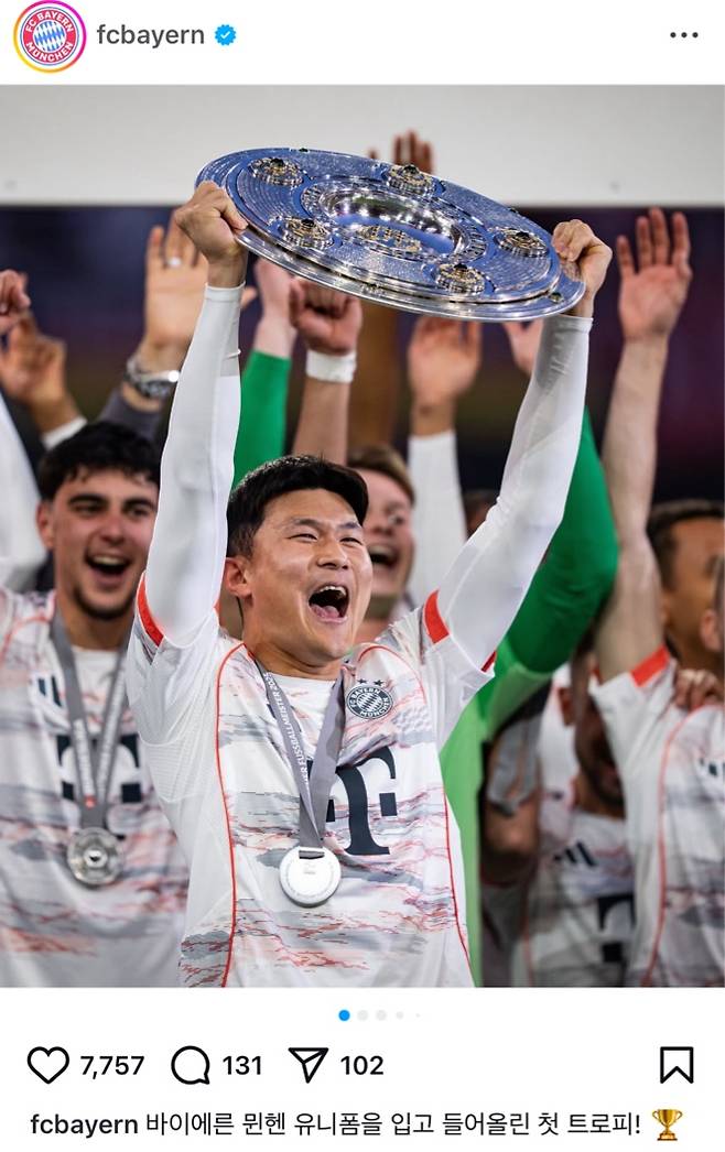 뮌헨이 12일(한국시간) 구단 사회관계망서비스(SNS)를 통해 "바이에른 뮌헨 유니폼을 입고 들어올린 첫 트로피!"라는 문구와 함께 김민재가 마이스터샬레를 손에 넣고 포효하고 있는 모습을 공개했다.