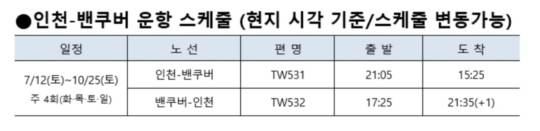 티웨이항공 관계자는 "캐나다 밴쿠버에 국내 LCC 최초 취항하게 됐다"며 "양국 교류가 더욱 확대되길 기대한다"고 말했다.