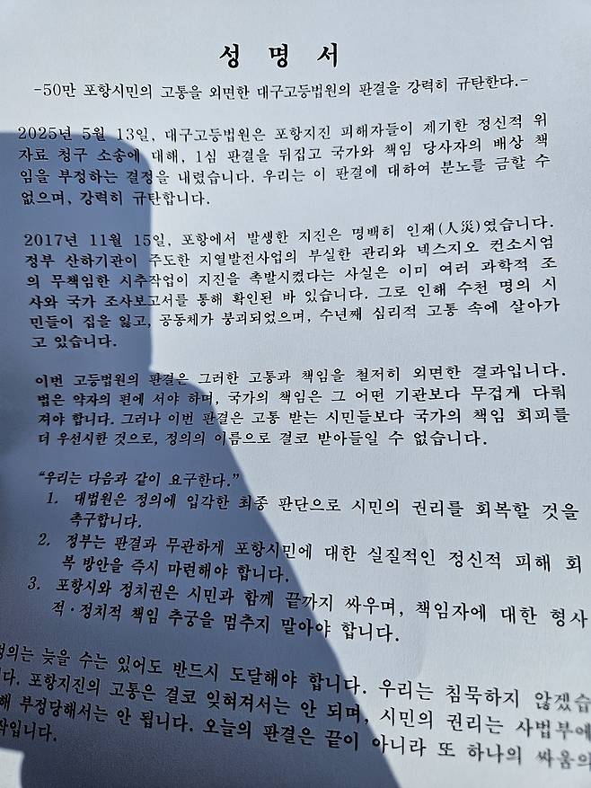 포항지진관련 범대본에서 대구고법의 포항지진관련 선고를 접하고 성명서를 발표했다.