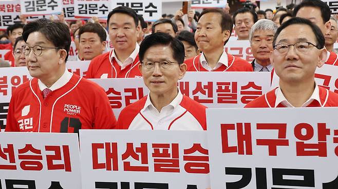 ▲ 국민의힘 김문수 대선 후보가 13일 국민의힘 대구시당에서 열린 대구경북 선대위 출정식 및 임명장 수여식에서 피켓팅을 하고 있다.