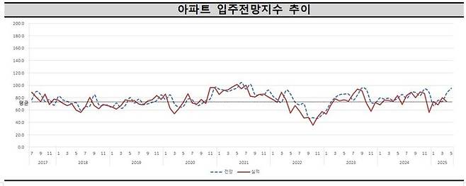 수도권은 서울(87.8→110.2, 22.4p↑)과 인천(85.7→89.6, 3.9p↑), 경기(85.7→97.2, 11.5p↑) 모두 상승했다. 특히 서울은 지난해 10월(111.4) 이후 7개월 만에 입주전망지수가 '110'선을 넘어섰다.
