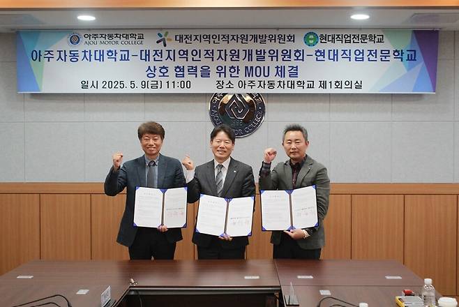 대전지역인적자원개발위원회는 지난 9일 아주자동차대학교에서 한명석 아주자동차대학교 총장, 유성식 현대직업전문학교 이사장, 권용대 대전RSC 사무국장 등 관계자들이 참석한 가운데 아주자동차대학교, 현대직업전문학교와 '자동차 정비인력 양성을 위한 업무협약'을 체결했다고 밝혔다.
