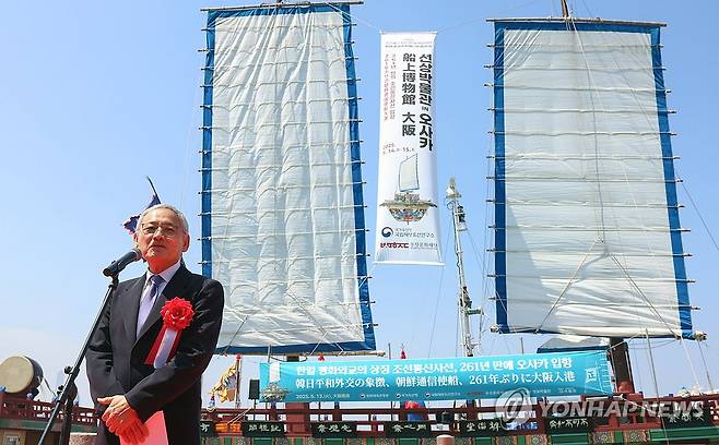 (서울=연합뉴스) 유인촌 문화체육관광부 장관이 13일 일본 오사카항에서 열린 조선통신사선 오사카 입항식에서 축사하고 있다. 2025.5.13 [문화체육관광부 제공. 재판매 및 DB 금지]