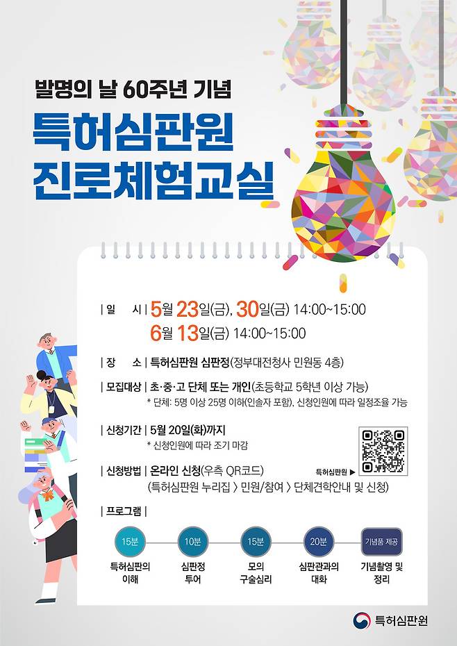 이번 체험교실은 정부대전청사 민원동에 위치한 특허심판원 심판정에서 열리며, 모집대상은 초·중·고등학생(초등학생은 5학년 이상)으로 5명 이상 25명 이하(인솔자 포함, 신청인원에 따라 일정조율 가능)의 단체 또는 개인이 5월20일까지 특허심판원 누리집(www.kipo.go.kr/ptab > 민원/참여 > 단체견학안내 및 신청을 통해 신청할 수 있다.