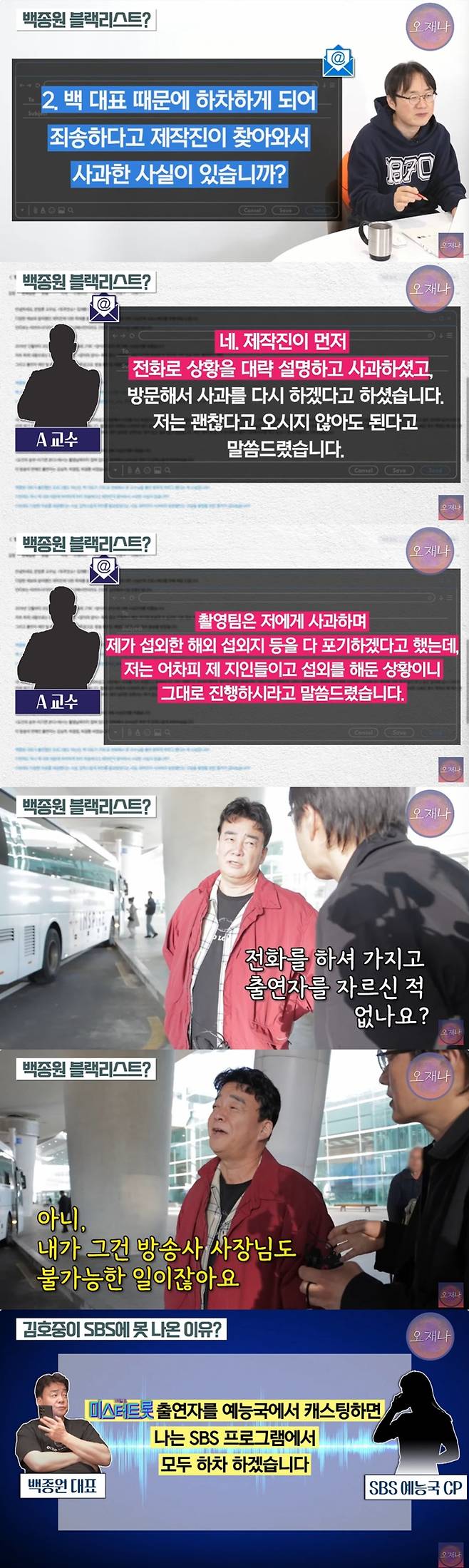 이 외에도 김재환 PD는 백종원은 자신이 직접 출연하지 않는 프로그램에도 그 교수에 대해 출연자 하차에 개입했다는 주장과 증거를 내세웠다.