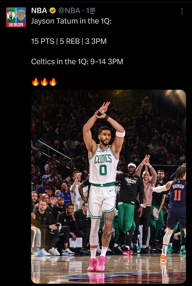 테이텀의 수비는 강했다. 강하게 압박한 테이텀은 경기 시작 3분 12초 만에 2개의 스틸을 기록했다. 특히, 두 번째 스틸 이후에는 속공 레이업까지. 13-4를 만들었고, 뉴욕의 첫 번째 타임 아웃을 소진시켰다.