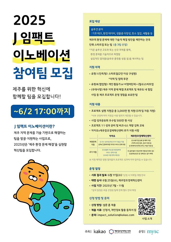 제주창조경제혁신센터와 카카오는 13일, 제주 지역 환경문제를 기술로 해결할 참가팀을 발굴하는 ‘2025 J 임팩트 이노베이션’ 오픈이노베이션 프로젝트를 공식 공모한다고 밝혔습니다.