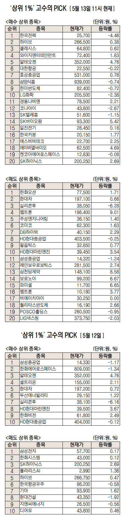 이날 미래에셋증권에 따르면 미래에셋증권 주식 거래 고객 중 최근 1개월간 투자수익률 상위 1%에 해당하는 ‘주식 초고수’들이 오전 11시까지 가장 많이 사들인 종목은 한국전력공사다.