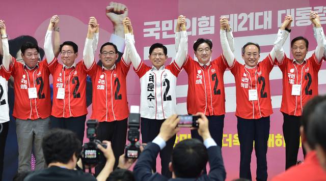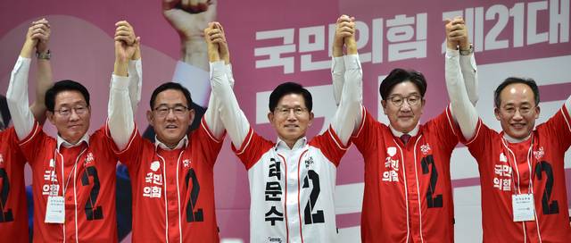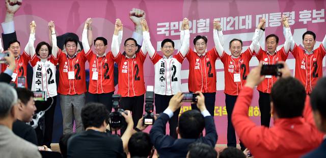 김문수 국민의힘 대선 후보가 13일 오전 대구 수성구 대구시당사에서 열린 대구·경북 선거대책위원회 출정식 및 임명장 수여식에서 대구 선거대책위원장들 손을 들어 보이며 필승을 다짐하고 있다. 김진홍 기자 solmin@idaegu.com