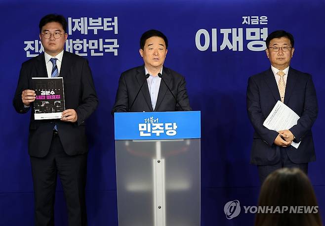 (서울=연합뉴스) 서명곤 기자 = 13일 서울 여의도 더불어민주당사에서 열린 중앙선거대책위원회 신속대응단 기자회견에서 강득구 단장(가운데), 정준호 부단장(왼쪽), 박관천 부단장이 국민의힘 김문수 후보 내란비호집 관련 브리핑을 하고 있다. 2025.5.13