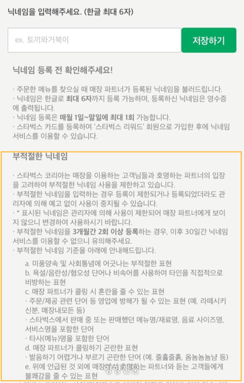 스타벅스는 부적절한 닉네임 기준으로 미풍양속 및 사회통념에 어긋나는 표현, 타인을 직접적으로 비방하는 표현, 매장 파트너가 부르기 곤란한 표현, 불쾌감을 주는 표현 등을 두고 있다. 스타벅스 내에는 부적절한 닉네임을 상시 모니터링하는 팀이 있는 것으로 알려졌다.