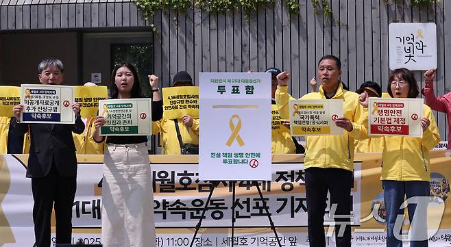 (서울=뉴스1) 박지혜 기자 = 13일 서울 중구 세월호 기억공간 앞에서 열린 4·16세월호참사 4대 정책과제 약속운동 선포 기자회견에서 참석자들이 21대 대통령에게 시민의 목소리를 전달하는 투표 퍼포먼스를 펼치고 있다. 2025.5.13/뉴스1