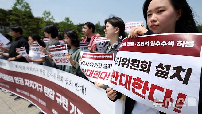 [서울=뉴시스] 추상철 기자 = 고려대 학내인권단체협의회가 13일 오전 서울 성북구 고려대학교에서 '고려대 총학생회의 인권 자치기구 탄압 규탄' 기자회견을 하고 있다. 2025.05.13. scchoo@newsis.com