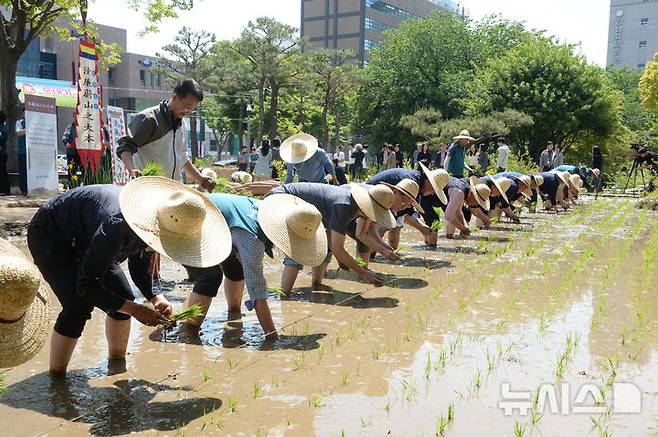 [울산=뉴시스] 배병수 기자 = 13일 오전 울산시청 내 논 정원에서 김두겸 시장과 시 간부들이 참석한 가운데 풍년을 기원하는 청렴미(米) 모내기 행사를 진행하고 있다. 2025.05.13.bbs@newsis.com.