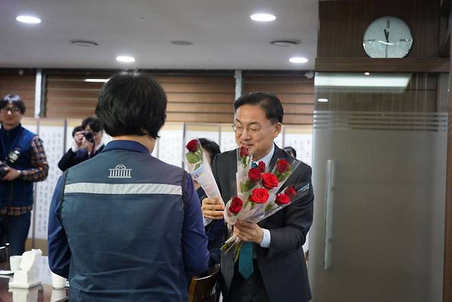 | ▲ 3.8여성의날을 앞둔 2025년 3월 6일 국회 청소노동자들과 만난 신장식 조국혁신당 의원이 장미꽃을 나눠주고 있다. |