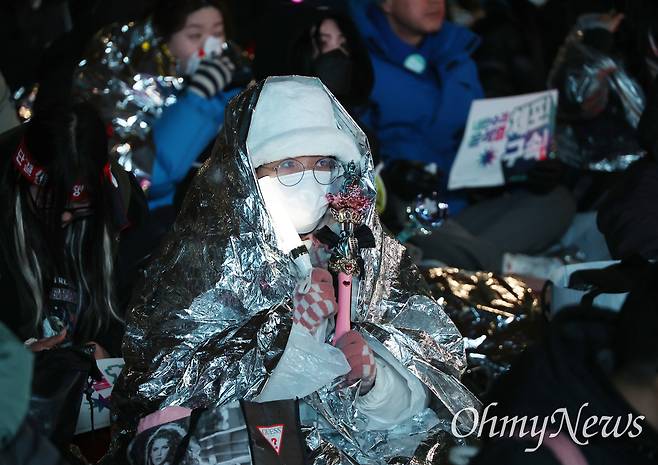 | ▲ 2025년 1월 5일 오후 서울 용산구 한남동 대통령 관저앞 도로에서 ‘내란수괴 윤석열 체포, 구속’ 촉구 집회가 윤석열퇴진비상행동 주최로 열리는 가운데, 한 참가자가 은박 담요를 쓴 태 응원봉을 들고 있다. |