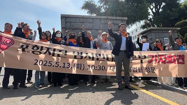 ▲ 13일 대구고법 정문에서 포항지진범시민대책본부가 포항지진 관련 항소심 패소 후 기자회견을 열고 있다.