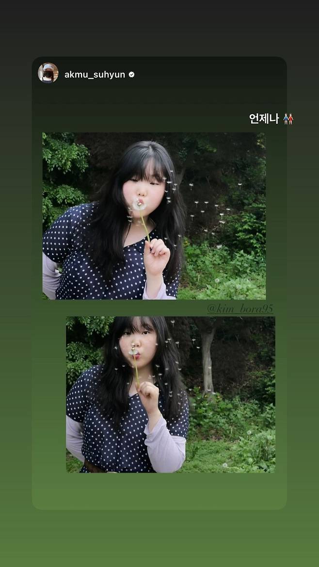 해당 게시물에는 이수현이 민들레 홀씨를 부는 모습이 담겼다. 이수현은 사진을 공개하며 김보라를 태그했다.