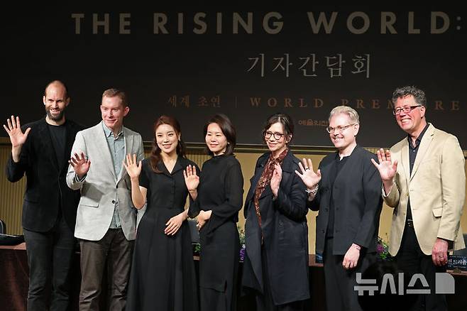 [서울=뉴시스] 박진희 기자 = 예술의전당 신작 오페라 'The Rising World: 물의 정령' 지휘 스티븐 오즈굿(오른쪽부터), 연출 스티븐 카르, 작곡 메리 핀스터러, 메조소프라노 김정미, 소프라소 황수미, 테너 로빈 트리쥴러, 베이스바리톤 애슐리 리치가 13일 서울 서초구 예술의전당 음악당 인춘아트홀에서 기자간담회를 하고 있다. 2025.05.13. pak7130@newsis.com