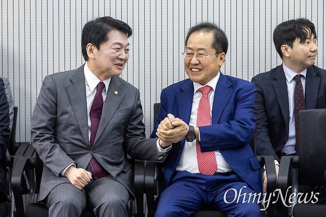 | ▲ 지난 4월 29일 오후 서울 여의도 국민의힘 중앙당사에서 안철수, 홍준표 후보가 대화하고 있다. |