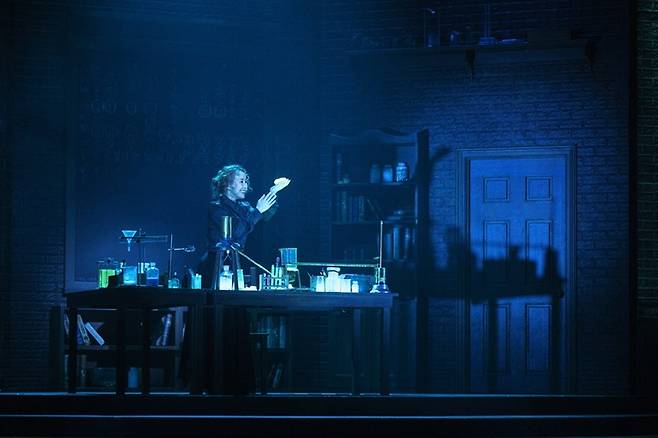 이번에 공개된 포스터는 영국 웨스트엔드 공연에서 쓰였던 포스터를 새롭게 리디자인한 버전이다. 검은 드레스를 입고 초록빛 플라스크를 바라보는 마리 퀴리의 뒷모습이 묘한 궁금증을 자극한다. 어둠 속에서 빛나는 플라스크는 그녀의 위대한 발견과 그 뒤에 숨은 깊은 고민까지 암시한다.