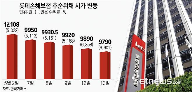 한국거래소에 따르면 이달 2일 기준 1만108원을 기록했던 롯데손해보험 채권 시가가 예정됐던 상환일 이후 △7일 9950원 △8일 9930.5원 △9일 9920원 △12일 9890원 △13일 9790원까지 하락했다.