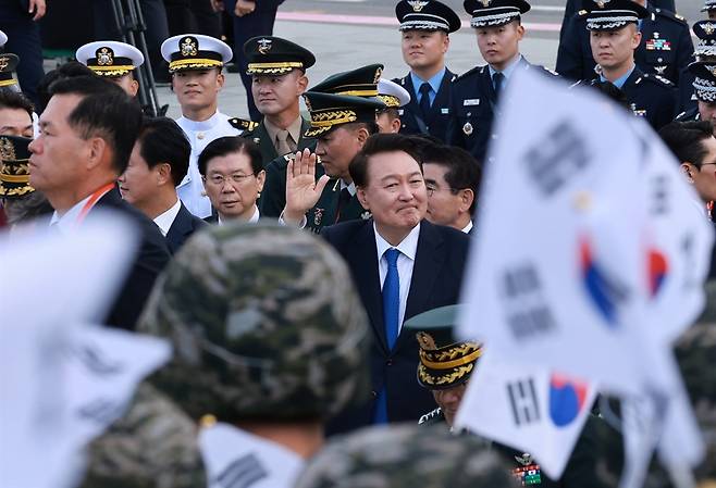 | ▲ 윤석열 대통령이 2024년 10월 1일 서울 광화문 일대에서 열린 국군의날 시가행진에서 국민들과 함께 광화문 월대를 향해 행진하며 인사하고 있다. |
