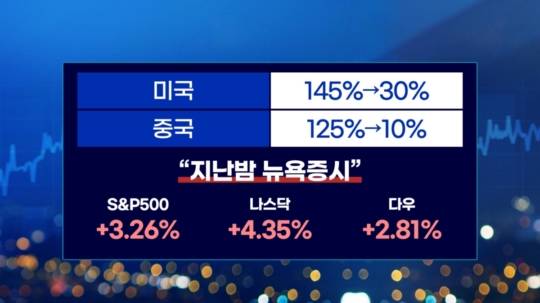 미국은 중국산 수입품 관세를 145%에서 30%로 낮추고 중국은 125%에서 10%로 인하하기로 결정했습니다. 양국 모두 115%포인트씩 물러난 것인데요, 예상을 뛰어넘는 화해무드에 간밤 뉴욕증시도 환호했습니다.