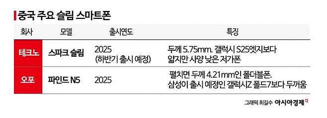 두께 측면에서만 보면 현재 중국의 '테크노'라는 제조사가 만든 '스파크 슬림'이 앞선다. 올해 하반기 출시 예정인데, 두께 5.75㎜로 갤럭시 S25 엣지(5.8㎜·163g)보다 0.05㎜ 더 얇게 출시될 것으로 알려졌다. 무게도 146g으로 17g 더 가볍다. 두 달 전 스페인 바르셀로나에서 열린 '모바일 월드 콩그레스(MWC) 2025'에서 선보여 눈길을 끈 바 있다.