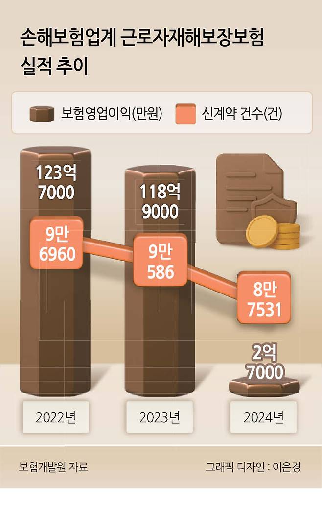 13일 보험개발원에 따르면 손해보험업계 근재보험의 신계약건수는 지난해 8만7000건을 기록하면서, 전년(9만건) 대비 3000건이 감소했다. 지난 2022년(9만6000건) 이후 2년 연속 감소세를 기록했다. 신계약 가입금액도 2022년 26조6000억원에서 2023년 20조8000억원 2024년 20조원 수준으로 감소 흐름을 보였다. 신계약뿐만 아니라 보유계약도 2022년 5만6000건에서 ▷2023년 5만4000건 ▷2024년 5만2000건으로 하락했다.