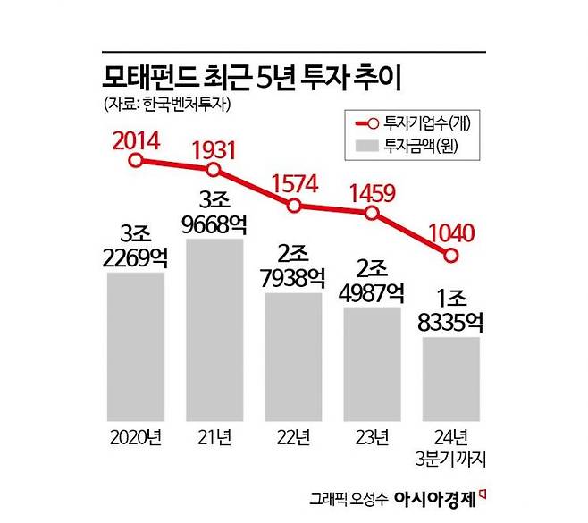 따라서 모태펀드 규모가 커지면 벤처캐피털 투자도 활성화되고, 반대로 모태펀드가 줄면 벤처 투자 자금도 줄 수밖에 없다. 윤석열 정부 시절, 재정건전성을 강조하면서 연구개발(R&D) 예산과 함께 스타트업 및 벤처 관련 예산도 대폭 줄었다. 2021년 4조원에 육박했던 모태펀드 투자금액이 3년 만에 거의 절반으로 줄었다. 자연스레 벤처 펀드 결성 규모도 2021년 17조8000억원에서 2024년 10조5000억원으로 확 줄었다.