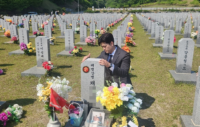 | ▲ 김용태 국민의힘 공동선거대책위원장이 12일 대전 유성구 국립대전현충원에서 채 상병 묘역을 참배하고 있다. |