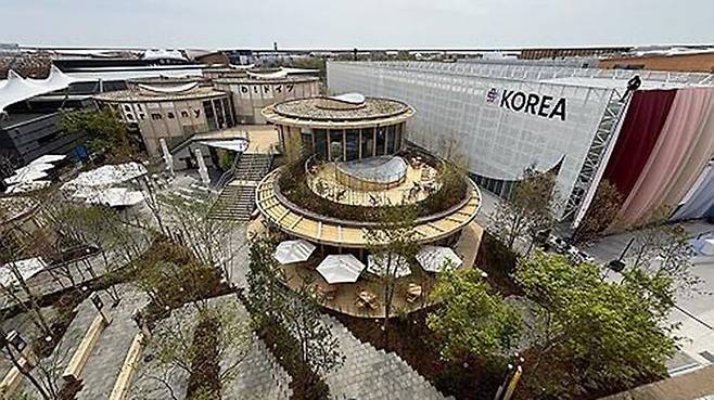 한국관은 '마음을 모아(With Hearts)'라는 주제를 골라 인공지능(AI), 수소연료전지, K-POP 등 첨단 기술과 문화의 조화를 통한 환경 회복, 세대 간 연결을 표현했습니다.