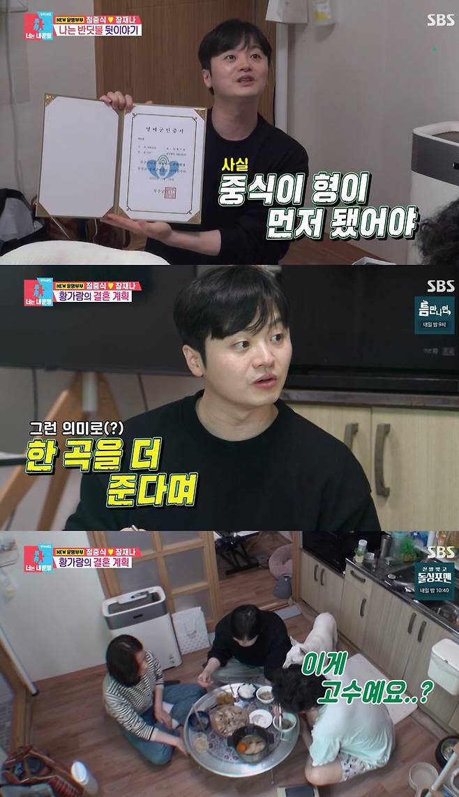 황가람은 지난 12일 방송한 SBS '동상이몽2 - 너는 내 운명'에 출연해, 자신의 히트곡 '나는 반딧불'의 원곡자 정중식과 예비신부 장재나를 만나는 모습을 공개했다.