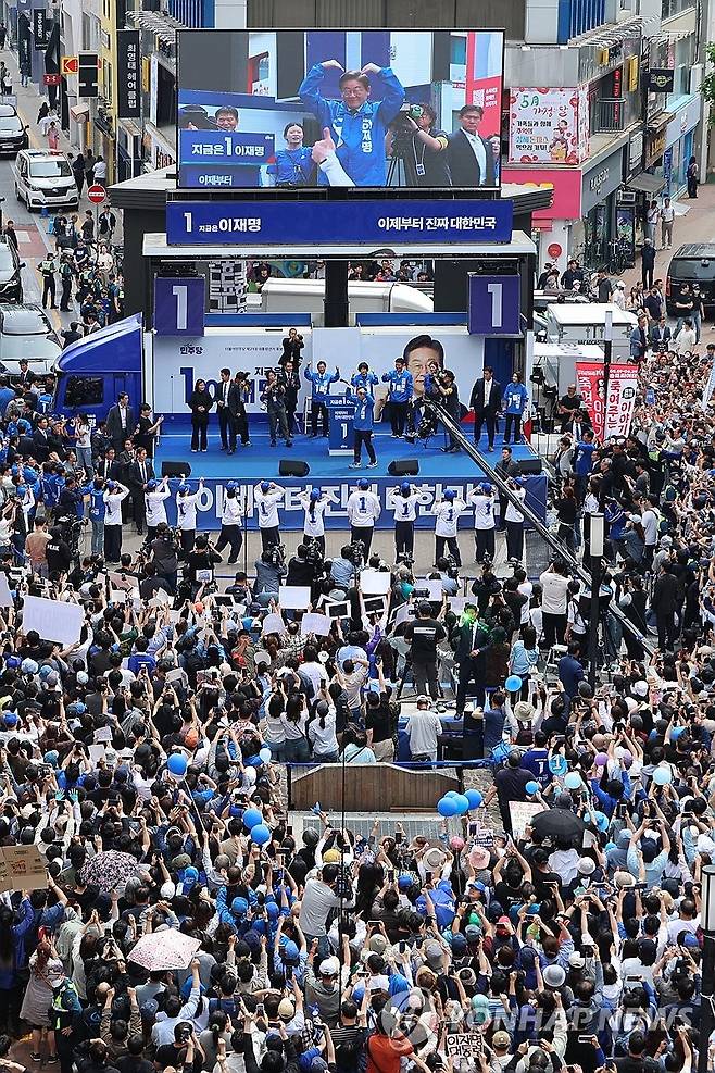(대구=연합뉴스) 김주성 기자 = 더불어민주당 이재명 대선 후보가 13일 '보수의 심장'이라고 불리는 대구광역시의 동성로 거리에서 집중 유세를 하고 있다. 2025.5.13