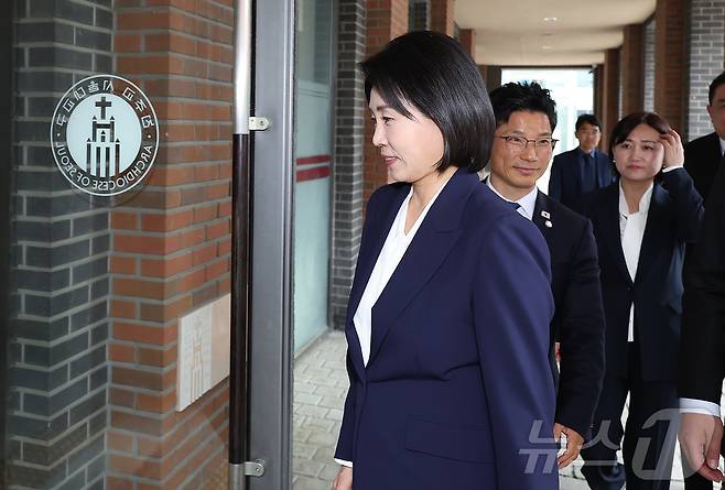 (서울=뉴스1) 장수영 기자 = 이재명 더불어민주당 대통령 후보의 부인 김혜경 여사가 13일 오후 서울 중구 천주교 서울대교구청에서 정순택 서울대교구장과 면담하기 위해 교구청으로 들어가고 있다.